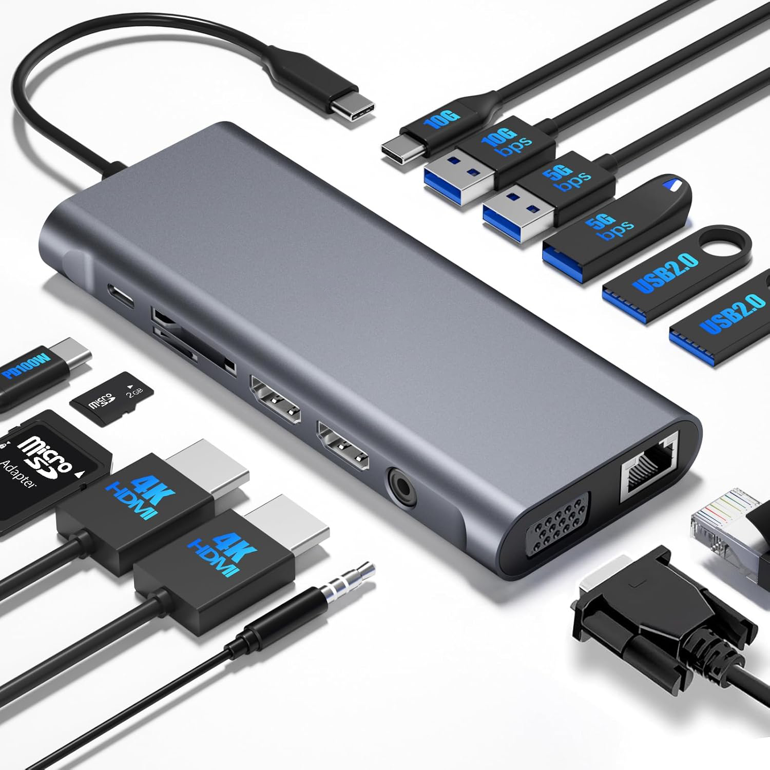 Card Reader: SD + TF/MicroSD — dual simultaneous reading at 5Gbps