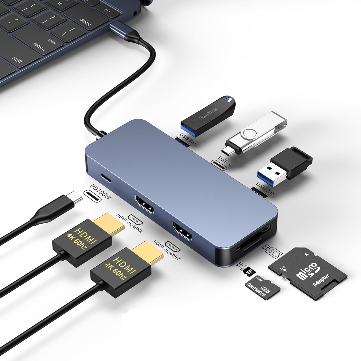 • 8-in-1 Connectivity Beast: Instantly expand your laptop with 2x HDMI 4K@60Hz ports, 100W USB-C PD, 1x USB 3.0 (5Gbps), 1x USB 2.0, 1x USB-C Data Port, and both SD/TF Card Readers.