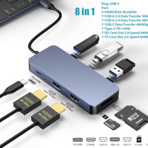 8-in-1 USB C Hub Docking Station Dual 4K@60Hz HDMI, 100W Power Delivery (PD) Multiport Adapter for MacBook Pro/Air, Dell, Windows Laptop, SD/TF Reader