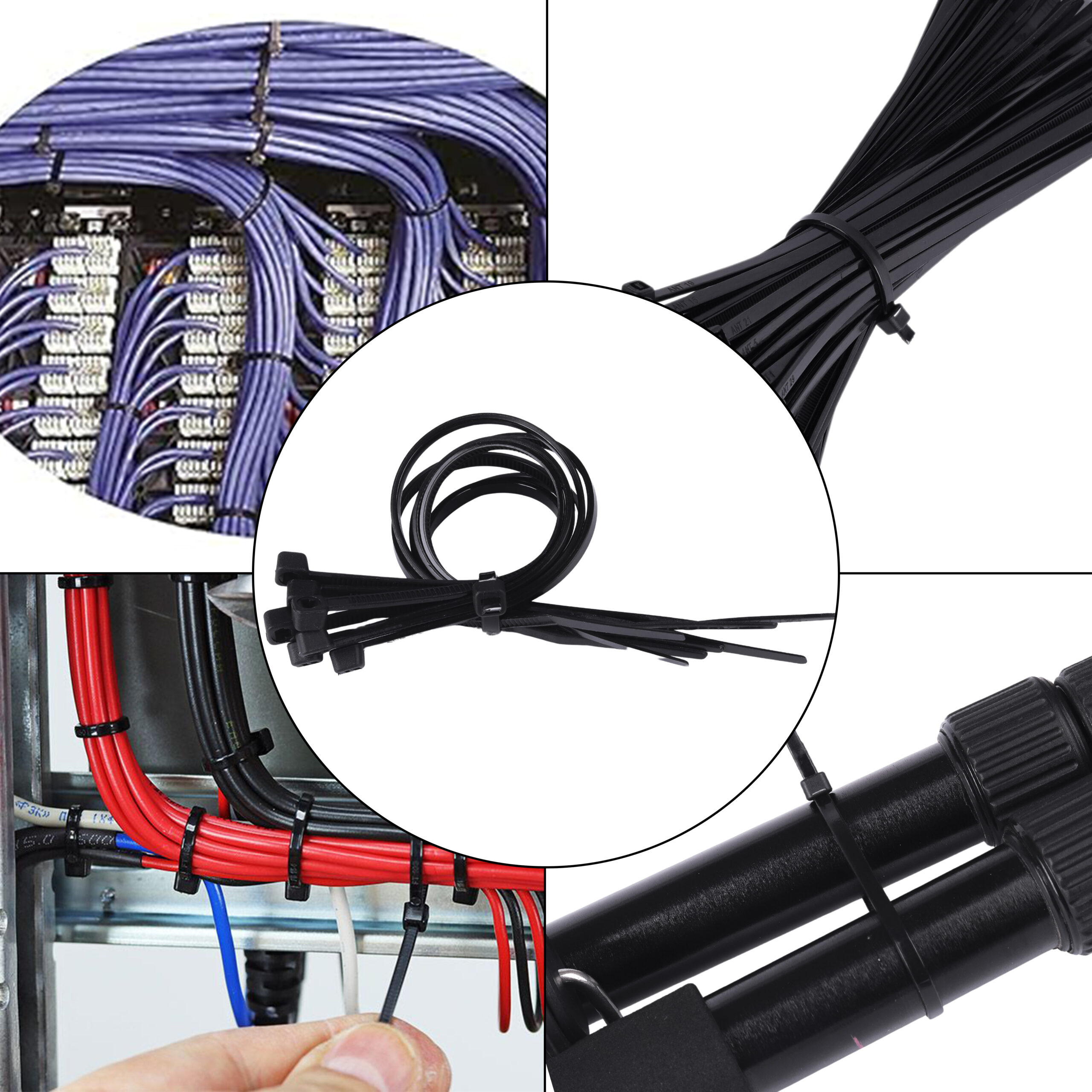Home and office use — tidy cables behind TVs, computers and entertainment systems. Garden use — secure plants, netting and outdoor wiring. Automotive — bundle wiring looms, secure hoses and cables under the bonnet. Electrical and construction — manage conduit, cables and pipe work on site. Events and exhibitions — temporary cable management for lighting and AV equipment. Industrial and warehouse — bundle, organise and label heavy duty cables and pipes.